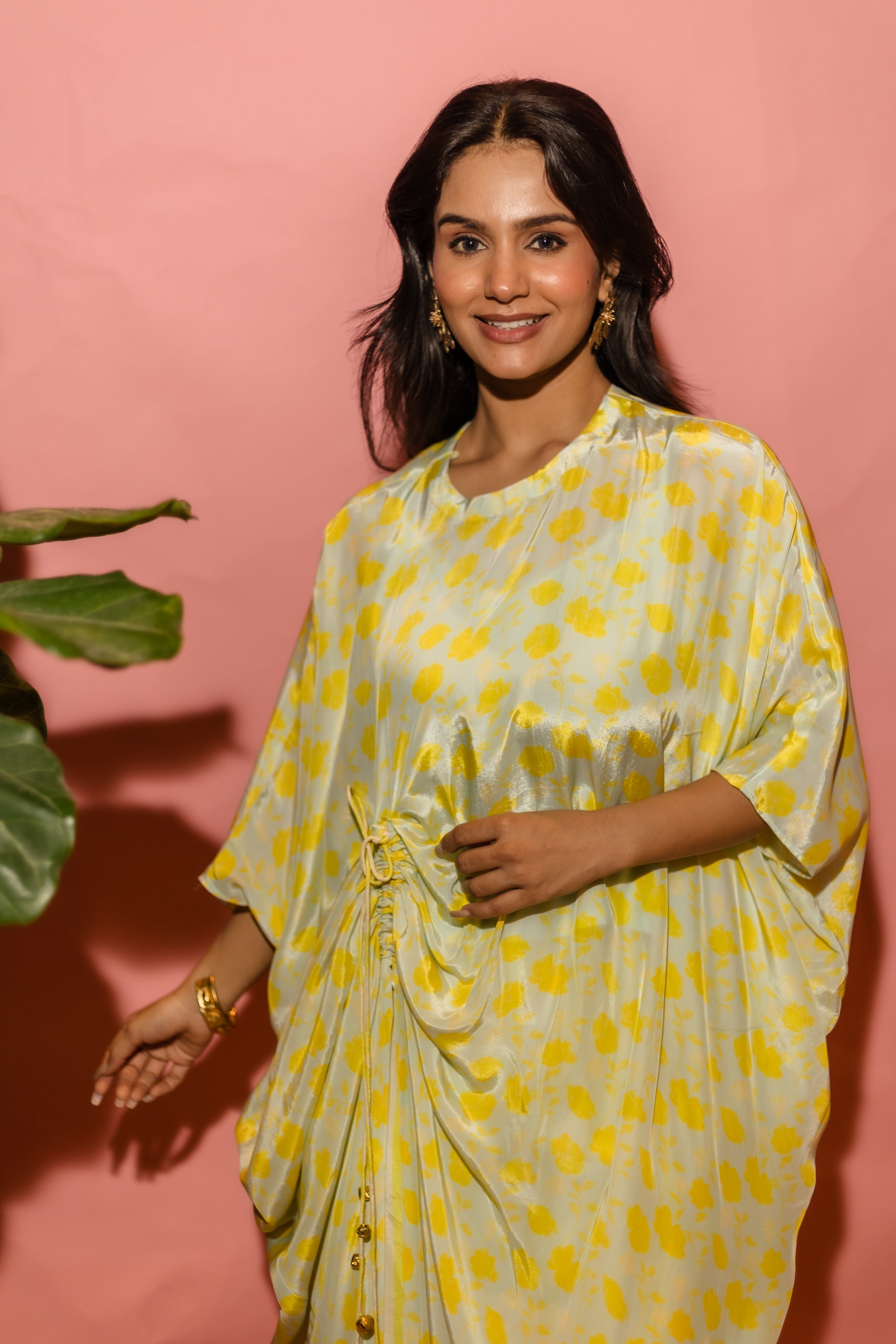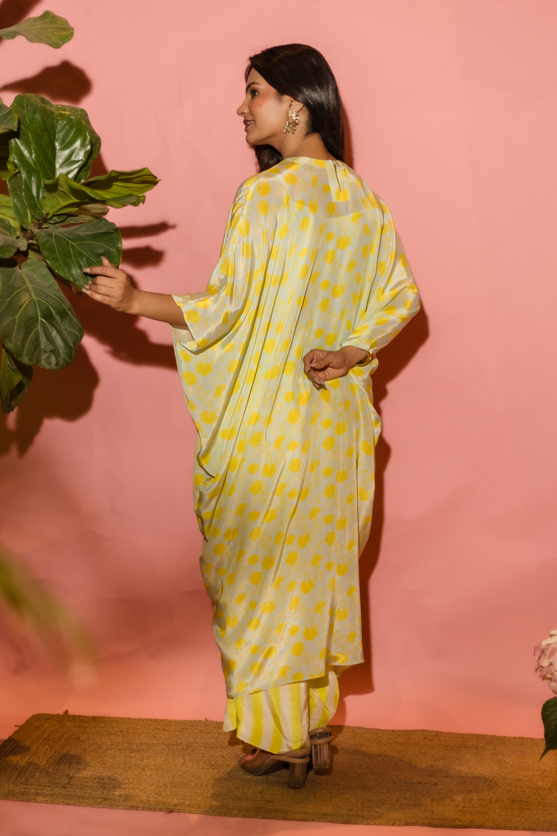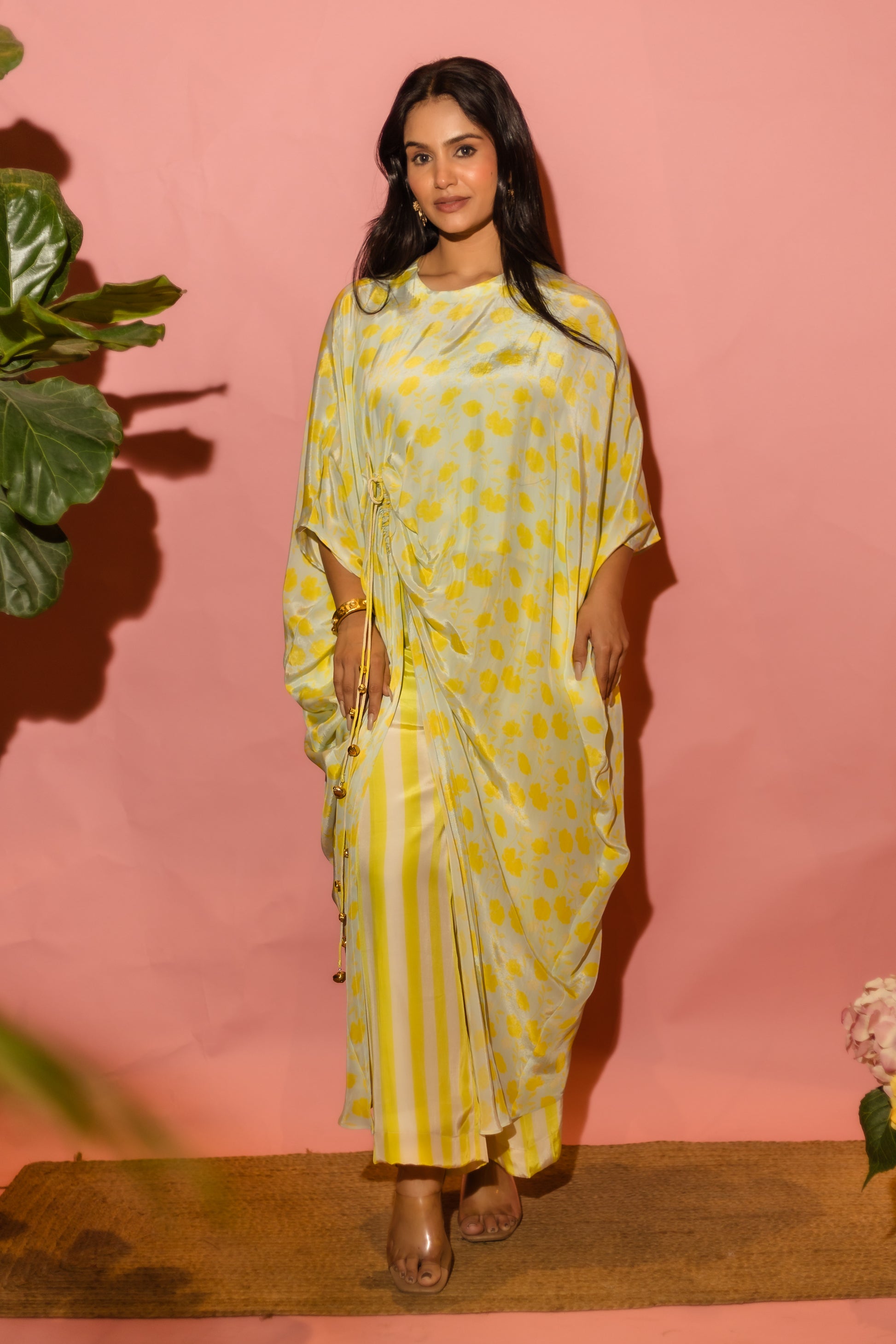 The kaftan features a flowing silhouette in fresh citrus hues, finished with an adjustable drawstring at the waist for a flattering, customizable fit. Lightweight and free-spirited, it pairs perfectly with high-waisted striped pants that add a modern edge to the look.