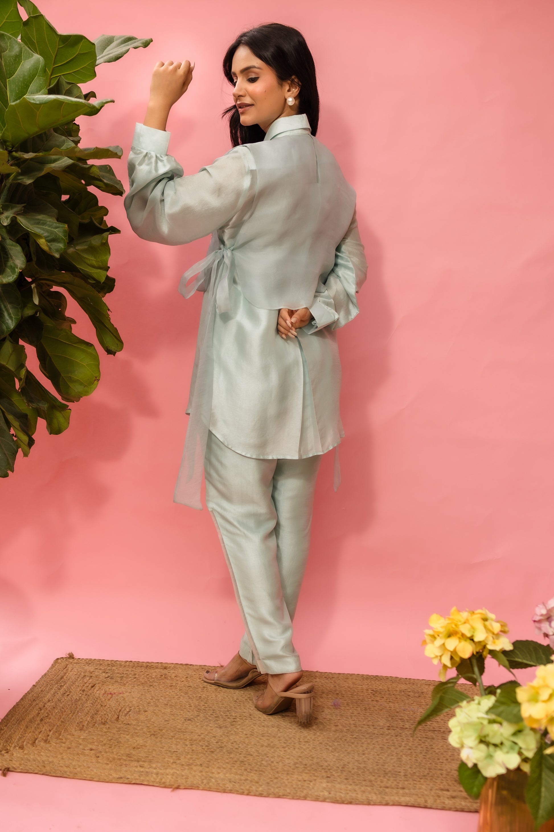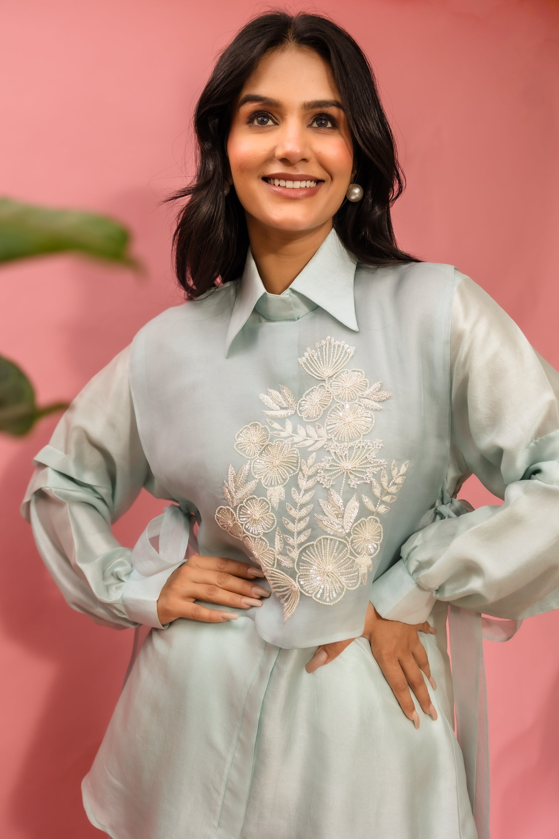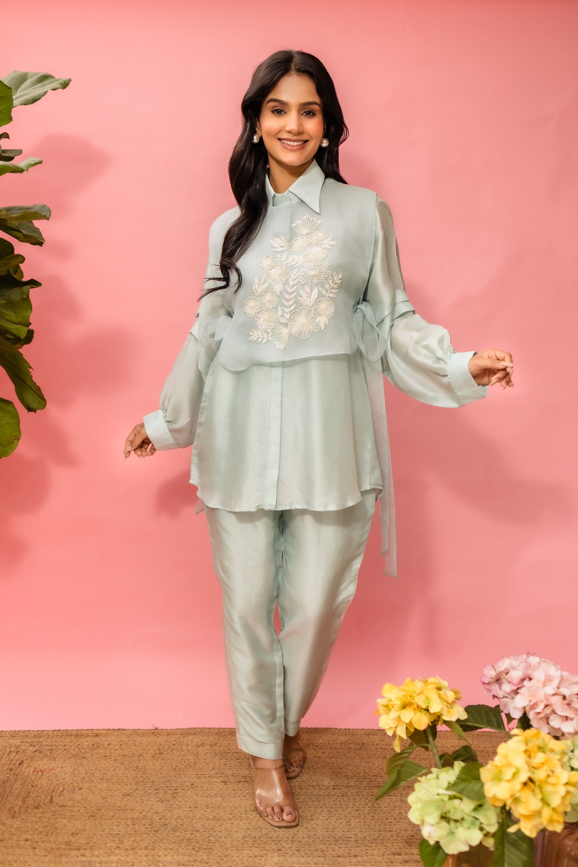 The lightweight, flowy capelet is adorned with soft floral motifs that add a touch of romance and movement to your look. Paired with a coordinated inner and tailored pants, this ensemble is designed for those who love refined silhouettes with a whisper of whimsy.