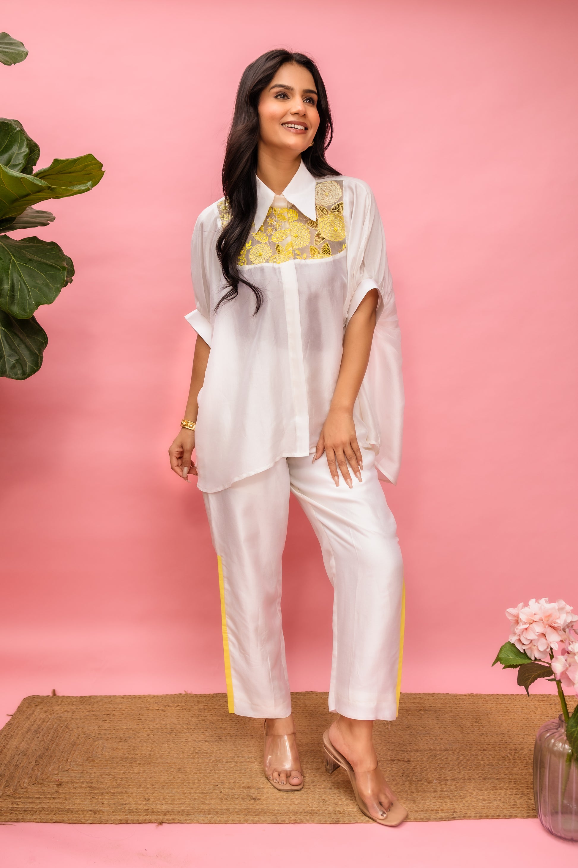 Featuring intricate French knot embroidery along the yoke, this boxy shirt brings a delicate, handcrafted touch to a structured silhouette. The relaxed fit pairs effortlessly with tailored pants, creating a look that is both sophisticated and comfortably chic.