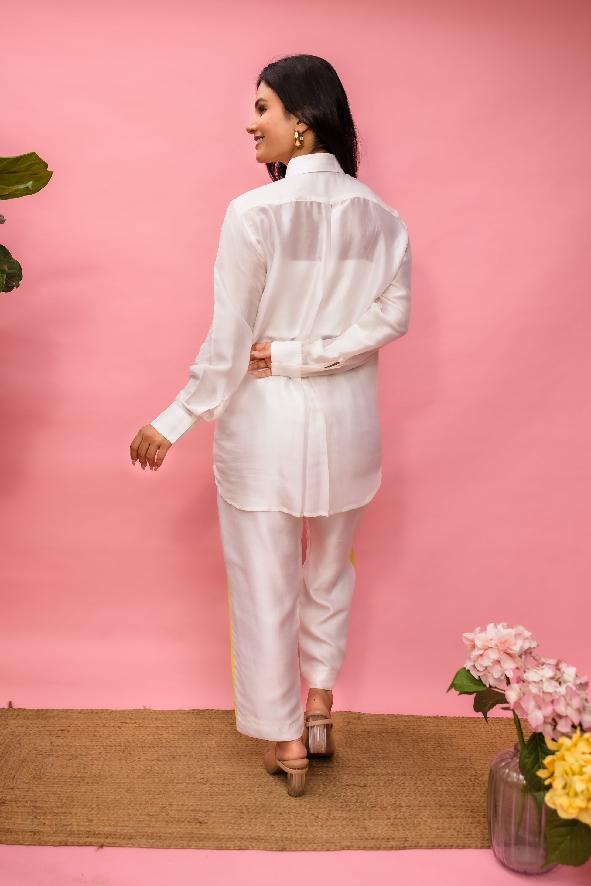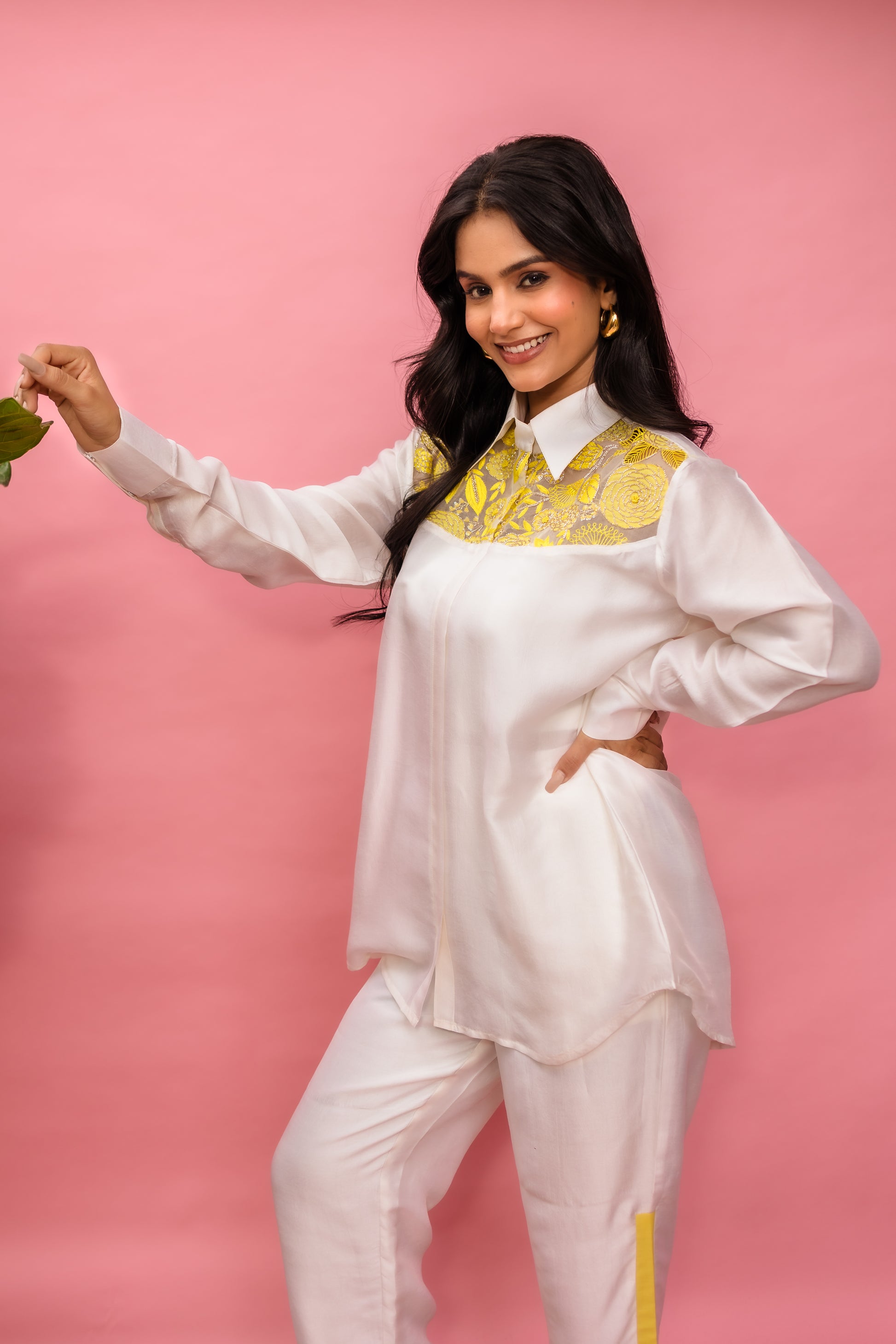 This refined ensemble features a beautifully crafted shirt adorned with intricate French knot embroidery along the yoke, adding a touch of understated luxury. Paired with sleek, tailored pants, the look is effortlessly sophisticated—perfect for both formal settings and elevated everyday wear.
