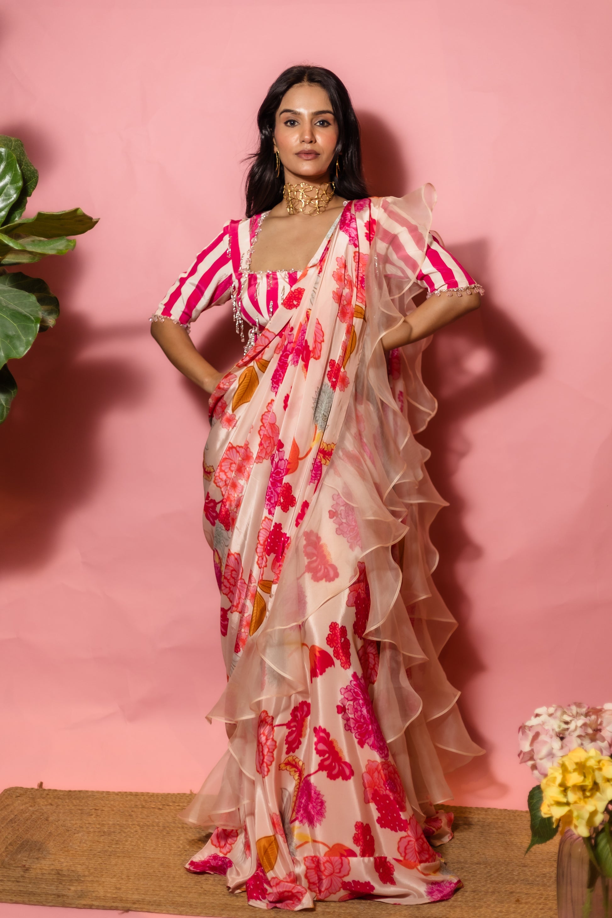 A dreamy blend of romantic charm and modern edge. The saree cascades in soft, layered ruffles that move with effortless grace. The delicate peach hue is adorned with subtle floral prints, evoking the fresh bloom of spring.Paired with a bold, contrasting stripe print blouse, this ensemble balances femininity with a contemporary twist. The blouse features a tailored silhouette and a flattering neckline, adding structure to the airy elegance of the saree.