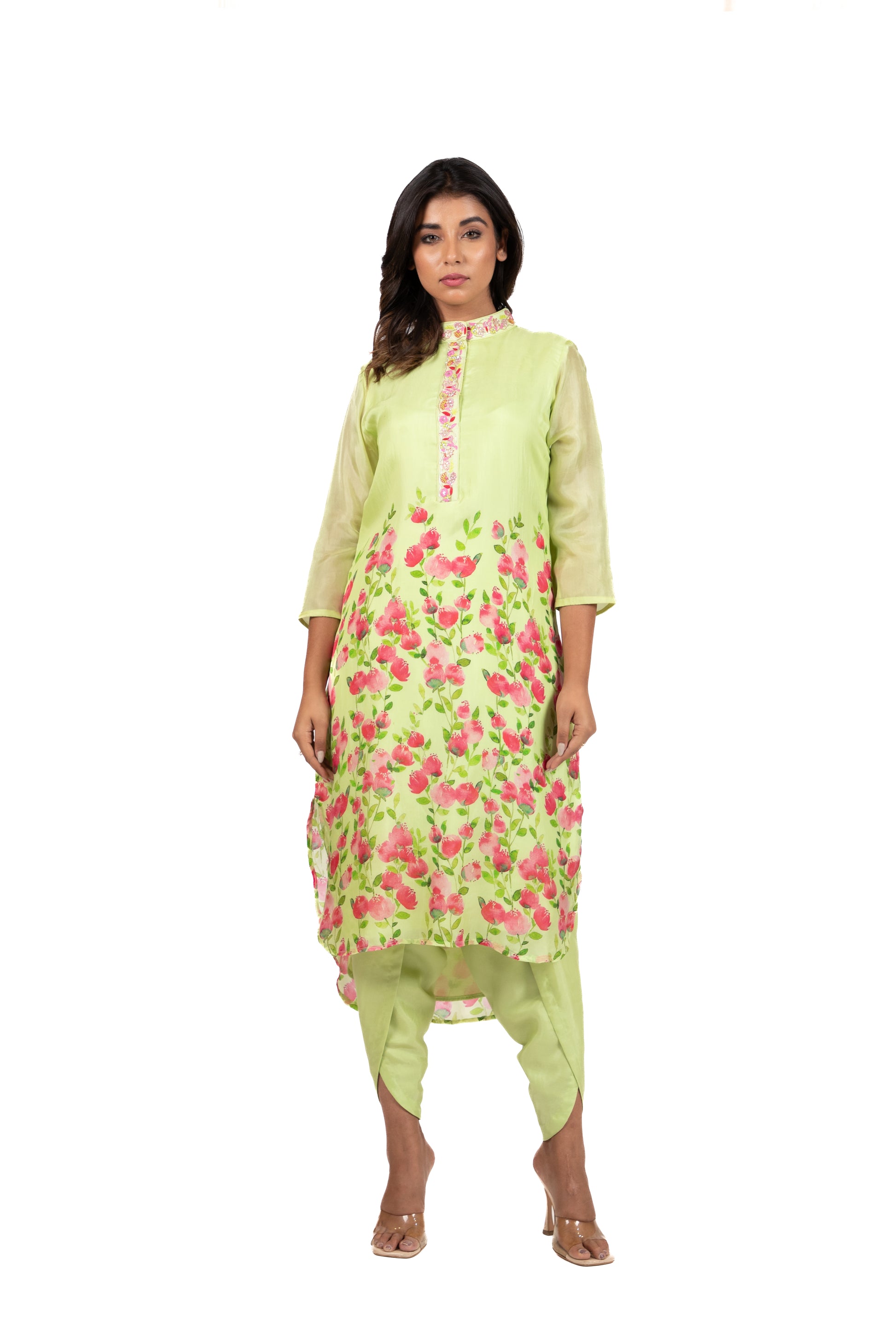 Embrace the charm of floral aesthetics and contemporary style in this exquisite ensemble. Explore the fusion of tradition and modernity, curated for the discerning fashion enthusiast. Elevate your wardrobe with the grace of roses and the flair of tulip pants, making a statement.